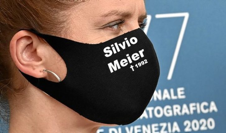 George Floyden hilketak eragindako protesta oldea Veneziako Zinema Jaialdira iritsi da. “Und Morgen Die Ganze Welt” filmaren zuzendariak, ekoizleak eta aktoreek herenegungo photocallean zeramatzaten musukoek neonazi alemanek azken hamarkadotan hildako pertsonen izen-abizenak idatzita zituzten. Irudian, Julia von Heinz zuzendaria, 1992an hil zuten Silvio Meier berlindar anarkista oroitzen duen musukoarekin.