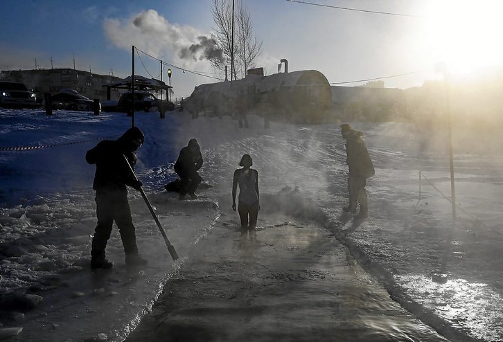 La temporada de natación de invierno está abierta en Siberia e imágenes como la de la fotografía no suelen ser insólitas, ya que en Rusia se considera que nadar en aguas heladas fortifica el cuerpo. Se practica a temperaturas heladoras en «piscinas» surgidas tras haber hecho un agujero en la capa de hielo y está considerado como deporte extremo. En la imagen, una integrante del club de natación de invierno de Novosibursk se adentra en el agua.