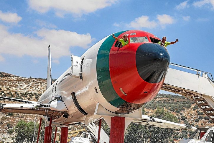 Más de 20 años después de «aterrizar» en un terreno aislado, en un valle muy seco de la Cisjordania ocupada, cerca de Naplusa, un Boeing 707 está listo para el despegue, está vez como restaurante. Su fuselaje está ya libre de asientos y moqueta y preparado para albergar mesas y sillas y acoger a comensales. Es el original proyecto de los gemelos palestinos Atallah y Khamis al-Sairafi, de 60 años, que en 1999 compraron la aeronave a un israelí de Kikyat Shmona y la trasladaron a un terreno de su propiedad. Un proceso nada fácil que asombró a los habitantes de Naplusa, ya que desde este territorio palestino, sin aeropuertos ni aviones, no se puede volar. Y allí se quedaron avión y proyecto, aplazado por la segunda Intifada (2000-2005), y cuando lo retomaron, por las restricciones a la circulación y, después, por la pandemia. Los trabajadores se pusieron manos a la obra hace unas semanas y, con el morro y la cola pintados con los colores de las banderas palestina y jordana –negro, blanco, verde y rojo–, el avión tiene ya dispuestas, como en una pista, sus escaleras de embarque.