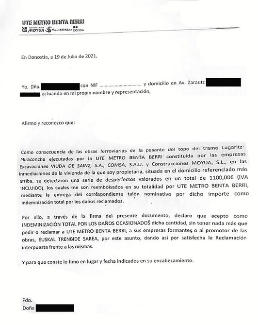 Se trata de la misiva recibida por una vecina de la Avenida Zarautz donostiarra, que prefiere mantenerse en el anonimato, en la que se le ofrecen 1.100 euros por «una serie de desperfectos» derivados de las citadas obras, sin especificar cuáles son las afecciones. Además, en un segundo párrafo, la carta añade que esa cantidad obedece a la «indemnización total por los daños ocasionados» y conlleva renunciar a «tener nada más que pedir o reclamar» tanto a la UTE Metro Benta Berri –compuesta por Construcciones Moyua, Excavaciones Viuda de Sainz y Comsa– como a Euskal Trenbide Sarea, dependiente del Gobierno de Lakua. Se da la circunstancia de que no hay certezas de que los problemas detectados estén ya solucionados o no vayan a reproducirse en otros puntos dada la delicada geología de estas zonas.