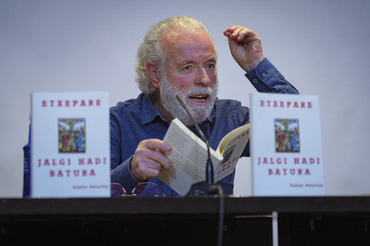 Xabier Amurizak (Etxano, 1941) Bernart Etxepareren (Sarasketa, 1480 inguruan) “Linguae vasconum primitiae” liburu ezagunaren bertsio-itzulpena aurkeztu zuen atzo Bilboko Euskaltzaindiaren egoitzan: “Etxepare, jalgi hadi batura”. Zehazki, 1545ean argitaratutako lehen euskal liburu inprimatuaren euskara batuko bertsioa da idazle bizkaitarrak atondu duena.
