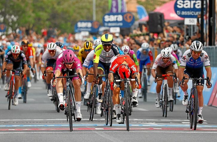 Démare no celebró la victoria hasta que le comunicaron el análisis de la fotofinish. La segunda en este Giro, la séptima en cinco participaciones en la prueba italiana, tiene más valor al lograr por delante de dos corredores que no pudieron disputarle el sprint el día anterior.