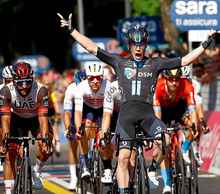 El Groupama quedaba como mejor equipo para preparar un sprint en este Giro, pero Arnaud Démare no llegó bien colocado. Quiso arrancar desde muy lejos, Gaviria le remontó con facilidad y cuando saboreaba la victoria le superó Dainese, que ya apuntó su velocidad el año pasado en la Vuelta con un segundo puesto y dos terceros. Solo había logrado dos victorias en profesionales en pruebas menores como la Vuelta a Chequia en 2019 y en el Herald Sun Tour en 2020 en su primera temporada en el entonces Sunweb y actual DSM.