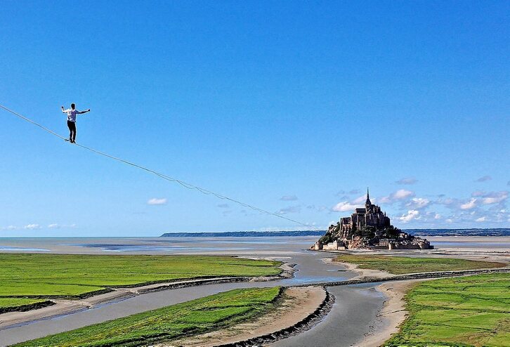 El funambulista francés Nathan Paulin anunció haber batido el martes un nuevo récord del mundo sobre la cuerda floja al recorrer 2.200 metros sobre un alambre suspendido a 100 metros de altura entre una grúa y la famosa abadía de Mont-Saint-Michel. Paulin, de 28 años, se dejó caer del cable después de dos horas apenas unos metros antes del final del recorrido «por motivos de seguridad», pero «alcanzó la marca, con lo que el récord de distancia se batió», aseguró su equipo. El anterior récord, 1.662 metros, estaba también en su poder.