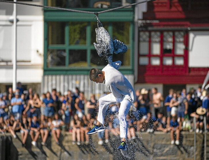 Antzararen lepoa besapera kiribildu eta eutsi, gora nahiz ur azpira, ia nork egingo altxada gehien, burua nork lortuko. Eta parte-hartzaileak nola, altxatu dira lekeitiar guztiak, pandemiak bi urtez ilundutako festen bueltarekin. Sanantolin jaietako Antzar Egunean animaliarik erabili ez den lehenengo urtea izan da hau, 2014tik antzara edo polimerozko panpina -Antzartek izenekoa- aukeran izan baitute parte-hartzaileek. Erabakiak ez du, gainera, parte-hartzea mugatu: alderantziz, 101 potin lehiatu ziren atzo, sekula baino gehiago.