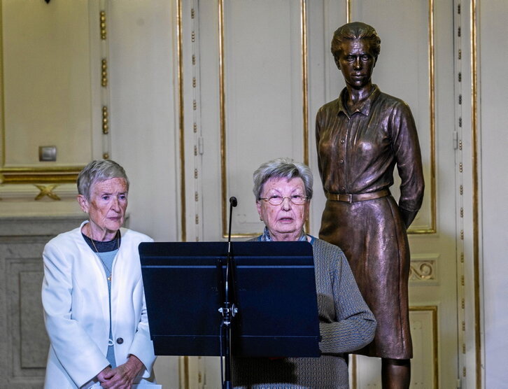 Francoren diktaduran, Elbira Zipitria (Zumaia, 1906 -Donostia, 1982) hezitzaile eta euskaltzaleak bizitza eskaini zien hizkuntzari eta hezkuntzari. Hainbat gurasoren laguntzaz, Donostiako Alde Zaharreko etxebizitza batean aritu zitzaien, klandestinitatean, haurrei irakasten eta andereño berriak formatu zituen garaian abangoardia zen begiradaz. Gipuzkoako Aldundiak aitortza egin dio eta atzoz geroztik, Lurdes Umerez azkoitiarrak egindako brontzezko eskultura ederra dago foru jauregian. Ekitaldian bere kideak izandakoek parte hartu zuten. Gorka RUBIO | FOKU