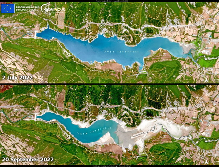Aspaldi honetan N-240 errepidean ibili eta Esako urtegira gerturatu denak badaki zein egoeratan dagoen; begiratua ematearekin nahikoa da ohartzeko ur falta ikaragarria dagoela. Egunkari honen azalean bertan argitaratutako argazki batean ere (irailaren 13ko zenbakian) ederki sumatzen zen gabezia. Baina Europar Batasunaren Copernicus programako Sentinel-2 sateliteak bi hilabete eta erdiko tartearekin ateratako bi argazki hauek are nabarmenago adierazten dute egoera zer-nolakoa den, apenas hitzik baliatu gabe: penagarria.