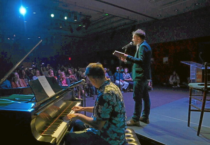 Bai, hona egindako lehenengo bidaian ere, 2003an, hemen egon zen. Nolabait zikloa ixteko ala berria zabaltzeko, ez nago seguru... nik uste irekitzen ari garela. Pianoarekin lagundu zidan pasarte batzuk irakurtzen eta ondoren pare bat kantu abestu zituen, nire letrekin eginak. Oso eskuzabala izan zen hona horretarako bakarrik etorriz.