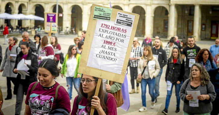 Hego Euskal Herriko adinekoen egoitzetako langileak lan-baldintza hobeak lortzeko borrokan ari dira. Mobilizazioak egin zituzten atzo Araban, Bizkaian, Gipuzkoan eta Nafarroan. Lehenengo greba eguna izan dute Araban eta Bizkaian, eta hirugarrena, Nafarroan. Gipuzkoan, berriz, duela hilabete batzuk hitzarmen berri bat sinatu zen arren, LABek ez du borroka amaitutzat ematen. Irudian, Arabako egoitza pribatuetako langileak, Gasteizko Plaza Berrian atzoko manifestazioari ekiten.