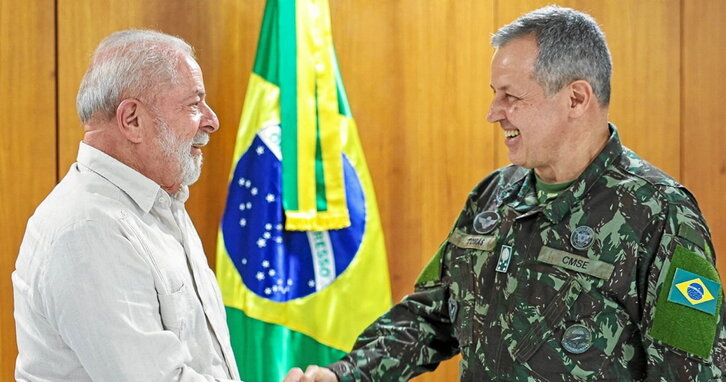 Lula presidenteak Armadako arduradun nagusia kargugabetu zuen atzo, «konfiantza hautsi» duela eta. Azken bi asteotan, Presidentetzaren administrazioarekin eta segurtasunarekin lotutako organoetan lan egiten zuten 140 militar kolpista inguru kanporatu ditu Lulak, administrazio publikoa desmilitarizatzeko helburuarekin. Gobernu berriak duen beste erronketako bat Armada «despolitizatzea» da edo, hobeto esanda, kuartelak ordena konstituzionalaren alde lerratzea. Irudian, Tomas Paiva Armadako arduradun berriaren eta Lularen arteko bostekoa.