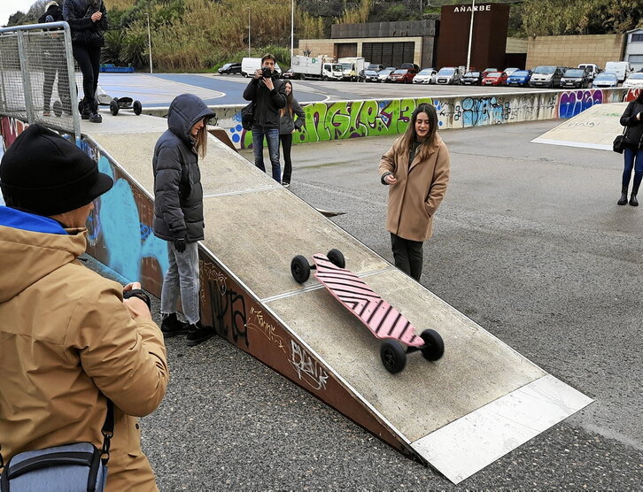 Diseñar y construir un monopatín todoterreno más sostenible, ligero y resistente. Ese era el reto al que se han enfrentado los y las estudiantes de tercero de Ingeniería en Ecotecnologías Industriales en Mondragon Unibertsitatea. Ayer tocaba probar los modelos. La primera prueba consistía en lanzarlos por una rampa, para ver si bajaban rectos o se desviaban. Luego tocaba subirse encima para ver cómo aguantaban el peso y, para finalizar, desplazarse sobre los monopatines. Las creaciones de cartón y corcho aguantaron el tirón.