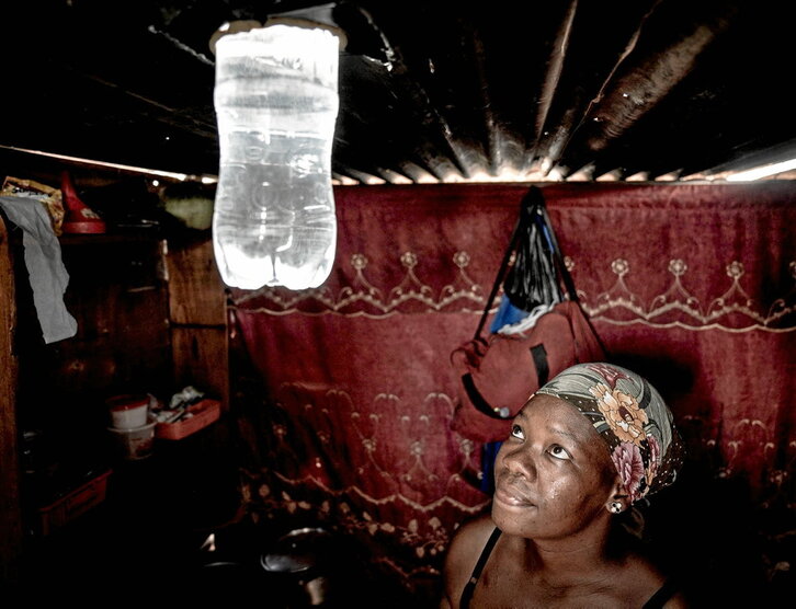 Krisi energetikoak eraginda, hilabeteak dira Hegoafrikan argindar mozketa programatuak pairatzen ari direla. Eskom energia enpresa publikoak ezin dio aurre egin egungo argindar eskariari, eta herritarrei galdegin die energia kontsumoa zain dezaten eta enpresei eguzki-plakak jar ditzaten. Horren aurrean, herritar asko -Gauteng probintziako Centurion hiriko familia hau bezalaxe- “eguzki-botilak” egiten eta erabiltzen hasi da: bi litroko ur botila, ur eta lixiba nahasketa, eta botilan islatzeko eguzki izpiak baino ez dira behar gela argiztatu ahal izateko.