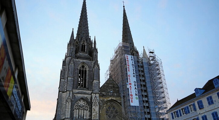 Una decena de activistas de Bizi! realizó ayer una espectacular acción de concienciación contra el cambio climático. Desplegaron en lo alto de la catedral de Baiona una pancarta de 60 metros cuadrados, en la que estaba escrito el lema “Urgence climatique - Ekintzak orain!”. Con ella los ecologistas pretendían interpelar a los electos vascos sobre la necesidad de acelerar la toma de medidas para reducir las emisiones de gases de efecto invernadero, una urgencia corroborada por las conclusiones del reciente informe del panel de expertos IPCC.