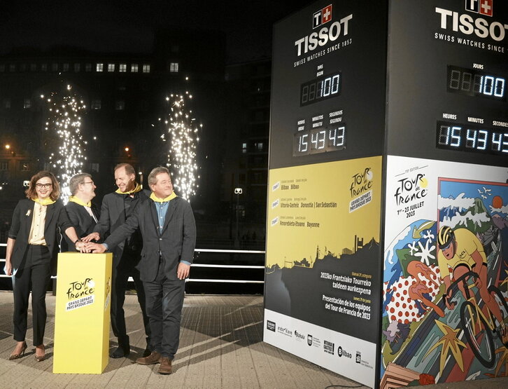 Tourra Euskal Herritik abiatuko da aurten. Kirol ekitaldi handienetakoa da eta, dimentsioarekin bat eginez, atzera kontaketarako erloju erraldoia jarri dute Bilbon, lehendabiziko etapa abiatuko den hirian. Ehun egun falta dira “Grand Dèpart” delakorako, eta datozen hilabeteetan ekintza ugari antolatuko dituzte txirrindularitza sustatzeko asmoz, nagusi zein gaztetxoenentzako proba zikloturistekin, besteak beste. Maillot hori erraldoia prest dago Bilbon, hiria apaintzen, 2023ko aurrenekoa nork jantziko, esperoan. Aldarrikapenek ere ez dute hutsik egingo. H. BILBAO | EUROPA PRESS