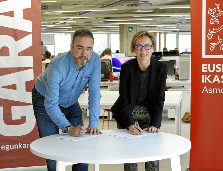 GARAk eta Eusko Ikaskuntzak hitzarmena sinatu zuten atzo, «lankidetza esparru bat» ezartzeko xedez. «Sinergiak sortu» nahi dituzte, edukiak «zorroztasunez landu» eta irakurleei helarazteko. «Talentua sustatzeko eta ezagutza trukatzeko» konpromisoa hartu zuten. Ana Urkiza ikaskuntza, ikerketa eta ezagutza bultzatzen dituen erakundearen lehendakariak eta Iñaki Soto euskal herritarrak ardatz dituen egunkariaren zuzendariak izenpetu zuten ituna, hedabidearen Donostiako erredakzioan. Aliantza «estrategikoa eta pozgarria» da bi aldeentzat.
