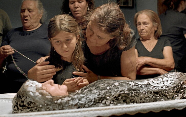 Otra obra muy personal y autobiográfica de una cineasta debutante, perteneciente a la generación de mujeres influenciadas por sus veraneos en la casa familiar del pueblo. Los suyos tuvieron que exiliarse en el Estado francés durante la dictadura de Salazar, y para su primer largometraje ha querido volver a los paisajes de su infancia en Trás-Os-Montes. El guion nace de los recuerdos sobre la muerte de su abuela, cuando una discusión por la herencia y el pago de la lápida de marmol postergó el entierro durante tiempo. Primero pensó en dar protagonismo a una nieta adolescente, pero por último consideró que, para el realismo mágico que quería insuflar a la narración, sería mejor que fuera una niña. En las pruebas con actrices infantiles, su hija Lua Michel se encargaba de dar la réplica, y la directora de casting acabó descubriendo que era la que mejor lo hacía. Sea verdad o no, sin duda la confianza con su madre le ha tenido que ayudar a manejarse con soltura, porque su interpretación es tan sencilla como cautivadora, pese a la complejidad de la situación que representa, al estar poseída por el espíritu de su querida “avoa”.