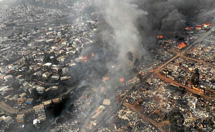 56 personas muertas, más de 370 desaparecidas y miles de hectáreas quemadas es el balance provisional de los incendios que desde el viernes asolan la región chilena de Valparaíso. Aunque se sospecha que son intencionados, las altas temperaturas, las fuertes rachas de viento, la baja humedad y el monocultivo de eucaliptos han alimentado unas llamas que han arrasado las viviendas precarias construidas en los cerros que rodean Viña del Mar. La falta de limpieza e infraestructuras en los barrios pobres también alimenta el fuego.