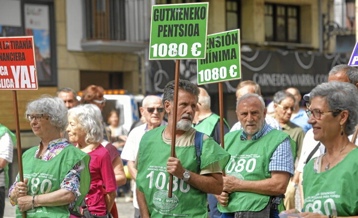 Atzo Euskal Herriko Pentsiodunen Mugimenduak mobilizazioei ekin zien berriro, Iruñean. Duela sei urte baino gehiagotik egiten dute gauza bera 80 herri eta hiritan, kalera astelehenero irten. «Gutxieneko pentsioak gero eta urriagoak dira, eta Estatuko gobernuak ez du ezer egiten 1.080 eurotan jartzeko», salatu zuten. Gasteiz eta Iruñeko Exekutiboek ere ez dituztela beharrezko erabakiak hartzen gehitu zuten. «Kalean jarraituko dugu gure eskari premiazkoenei eta ezinbestekoei erantzun arte», ziurtatu zuten.