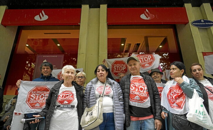 Kaleratzeak Stop kolektiboak protesta egin zuen atzo Donostian, Banco Santanderren aurrean, etxegabetze arriskuan dauden bi familia zaurgarriri babesa adierazteko. Hala, bankuari eskatu diote bost urteko gabealdia emateko eta bide judizialari amaiera emateko. Salatu zutenez, «onartezina da burbuila; 2008ko krisia eta etxegabetze masiboak eragin zituzten finantza-erakundeek, diru publikoarekin erreskatatuak izan zirenek, hipoteken negozioarekin dirua irabazten jarrai dezaten». Lehentasuna, beti, pertsonak izan behar dira.