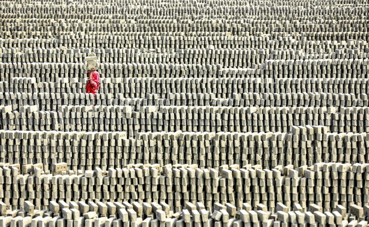 El enorme campo de ladrillos de la imagen se encuentra en el distrito de Keraniganj, Bangladés. Familias enteras, en muchos casos también con menores de edad, trabajan en él desde el amanecer hasta el atardecer. La emisión de numerosos elementos tóxicos proveniente de los hornos de ladrillo supone un grave riesgo para los trabajadores y para la población de toda la zona, que en su mayoría padece problemas respiratorios o cutáneos. En Bangladés hay miles de fábricas de ladrillos.