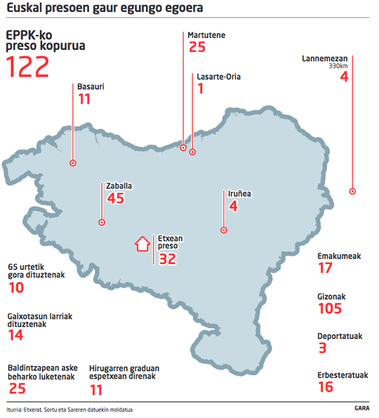 Euskal Herriko kartzela handiena izanik, multzo zabalena Zaballak hartzen du: 45 preso. Martutenen 25 dira, Basaurin 11 -Bizkaian egon arren espetxe txikiena-, eta Iruñean 4. Argazkia osatzeko, 105 gizonezkoak dira, eta 17 emakumeak.