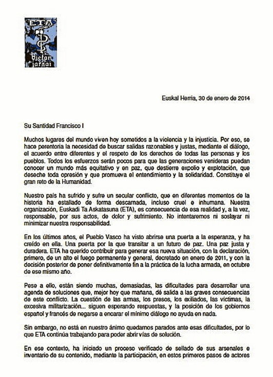 LA CARTA DE ETA AL PAPA FRANCISCO