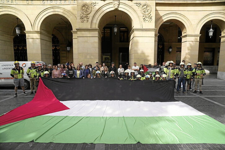 Palestinaren Aldeko Suhiltzaileek elkarretaratzea egin zuten atzo Gipuzkoako Foru Aldundian, Palestinari elkartasuna adierazteko unean Diputazioak duen jarrera salatzeko. Aldundiko Jauregian Palestinako bandera jartzearen aldeko sinadura bilketa ere egin dute. Lehen ere saiatu ziren banderak parkeetan jartzen, baina kentzeko agindua eman zuen Aldundiak.
