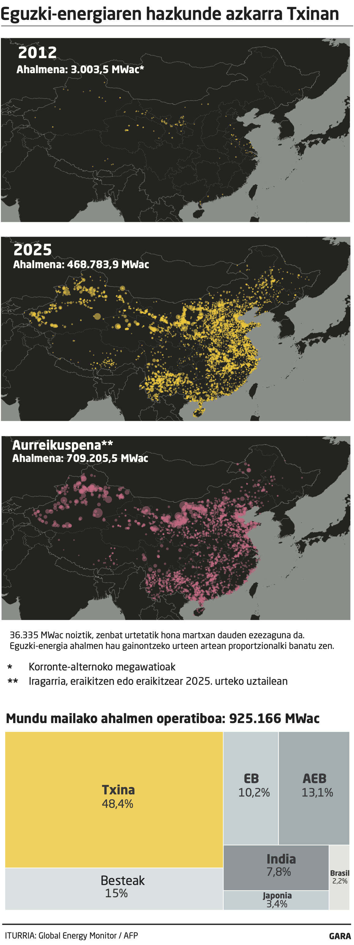 Bada, broma gutxi herrialdeko basamortuetako eremu zabalak hartuko dituen eguzki-plaken itsaso urdinarekin. Energia-trantsizio horren katebegi funtsezkoa dira, eta Txinako ekonomia planifikatuaren efizientzia ezagututa, aurreikuspenak benetan ikusgarriak dira: 2022. eta 2030. urteen artean, Europako herri nuklearizatuena den Frantziaren gaitasun elektrikoaren hirukoitza aterako da eguzki-plaken instalazio horietatik, planifikatu eta nazioarteari begira argitaratu dituzten txostenetan irakur daitekeenaren arabera.