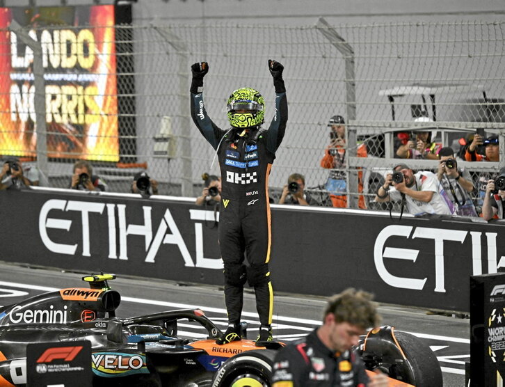 McLaren taldeko Lando Norris bihurtu zen atzo F1eko irabazle berria. Max Verstappen gailendu zen Abu Dhabiko Sari Nagusian, baina ez zuen behar adinako aldea lortu. Norrisek hirugarren postua eskuratu zuen; nahikoa munduko txapeldun berria bihurtzeko. Ukabila gora altxatuz eta su artifizialen artean ospatu zuen garaipena britainiarrak. Aurreko lau edizioak Max Verstappenek irabazi zituen, baina, aurten, amaitu egin da haren nagusitasuna. Bigarren postuarekin konformatu beharko du Verstappenek. Oscar Piastri izan da hirugarrena sailkapenean.
