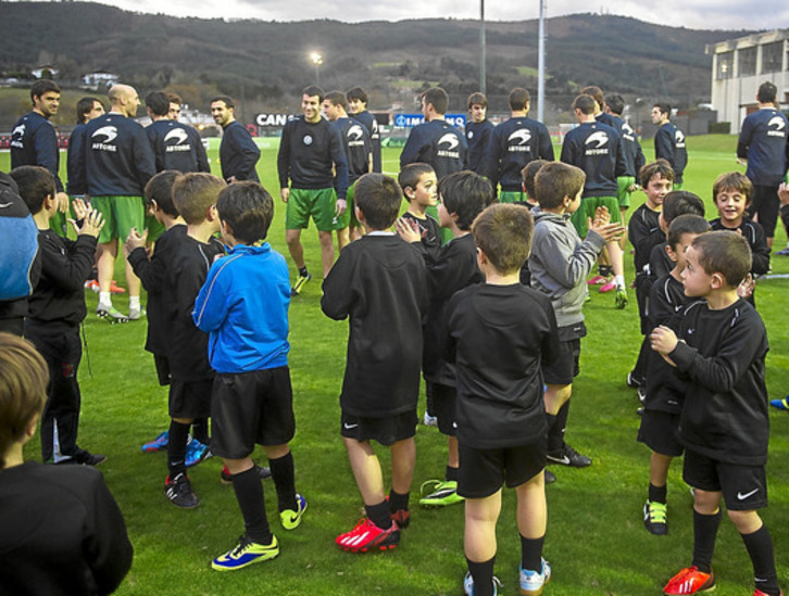 A lo largo de hora y media compartieron un ameno entrenamiento -formando siempre parejas o grupos entre los del mismo equipo- aunque antes también hubo tiempo para los saludos entre jugadores y fotos ante los medios gráficos. Al final de la sesión, Amorrortu y Etxarri dividieron a los convocados en dos equipos, que formaron, de azul con Eñaut, Iraola, Iñigo Martínez, Ansotegi, Aurtenetxe, Iturraspe, Beñat, Xabi Prieto, Roberto Torres, De Marcos y Aduriz, mientras que de verde lo hicieron Iraizoz, Oier, Ekiza, San José, Balenziaga, Bergara, Illarramendi, Susaeta, Ibai, Toquero y Agirretxe. Dos de Aduriz, otro de Beñat y uno más de De Marcos pudieron con el solitario tanto de Agirretxe.