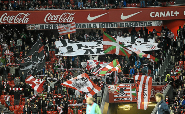 Primeros compases sobre el verde, primeros ejercicios vocales en la grada de animación, mientras se reparten hojas con el cancionero preparado. Mucho menú musical donde elegir, pero la cabra siempre tira al monte, así que resuena el clásico «Jo ta ke!» hasta que se arrancan con la versión adaptada del «ene maite, ene maite, ene maite, Athletic; sekulako ta betiko, maite zaitut Athletic», que interrumpe una falta sobre Muniain y que provoca los primeros chiflidos a coro.
