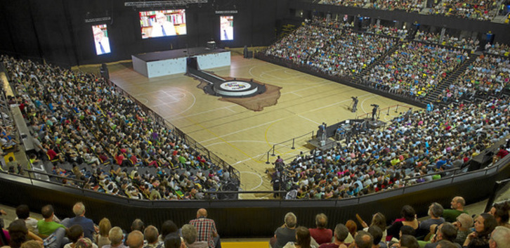 El acto de Miribilla resultó muy visual, tanto por las intervenciones en formato de vídeo como por las actuaciones que se fueron sucediendo en la cancha del pabellón. En algunos momentos se escuchó un único grito, reclamando la vuelta de los presos vascos a sus casas. También se veían desde banderolas por la repatriación hasta alguna bandera catalana, pero en un ambiente más bien sobrio.