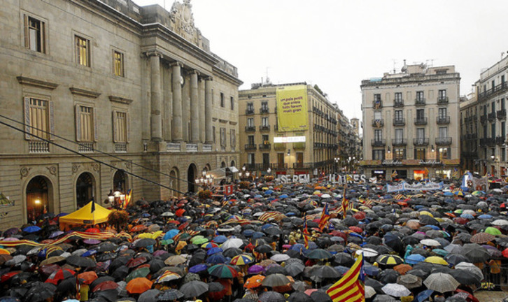 Paraguas en mano, en Barcelona se dieron cita representantes de CDC, ERC, ICV-EUiA y CUP -en muchos municipios acudieron también militantes de Unió y del PSC-, así como la presidenta de ANC, Carme Forcadell, que aseguró que «ningún tribunal decidirá nuestro futuro», y la presidenta de Òm- nium, Muriel Casals, quien garantizó que «esto es imparable, no lo para ni la lluvia ni un tribunal deslegitimado».