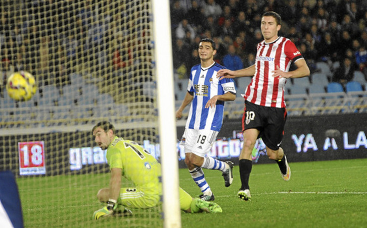 Fue un tiempo suficiente para ver las carencias de la Real con el balón. Lo movió sin velocidad, sin ideas y cayó en el anzuelo que le lanzó el Athletic para que buscara centros laterales que encontraban respuesta en los centrales y los dos medios centros rojiblancos.
