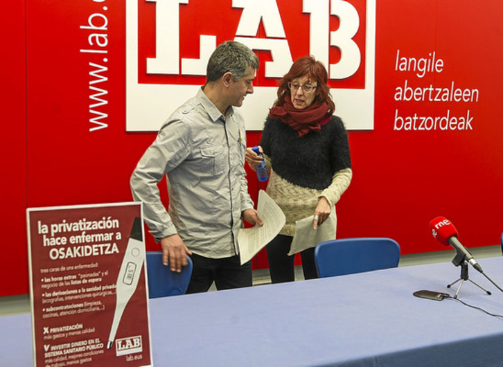 Este mes de marzo llega la fase final de la campaña contra las privatizaciones en la Sanidad Pública que LAB inició en enero. Como explicaron ayer Patxi Bezares y Ana Tere Álvarez, «terminamos esta campaña con las otras formas que emplea Osakidetza para privatizar. Nos referimos, en este caso, a la subcontratación de servicios públicos».