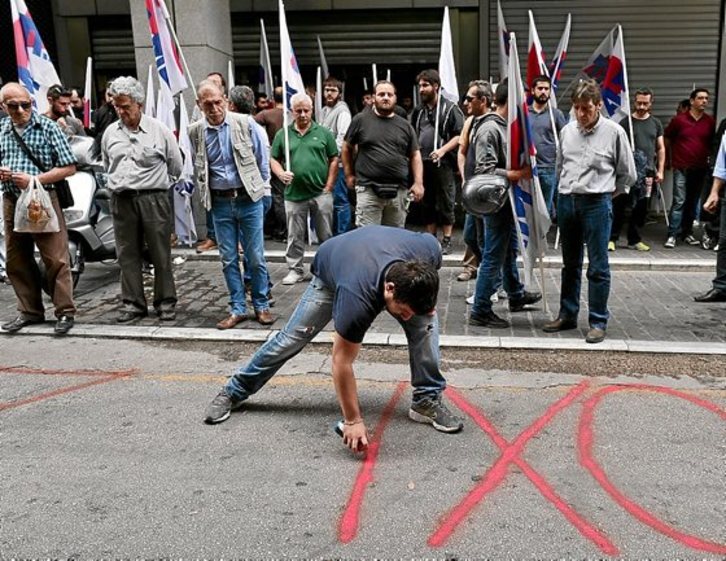Los manifestantes subieron hasta la azotea, desde donde colgaron una pancarta de doce metros de longitud, en la que se podía leer: «Ya hemos derramado bastante sangre. Ya hemos pagado bastante». GARA