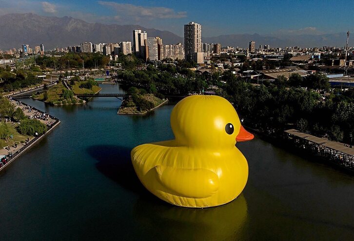 Flotando en las aguas del pulmón verde de Santiago de Chile, un gigantesco pato de hule anuncia el regreso del Festival Hecho en Casa tras dos años de ausencia por el estallido social y la pandemia. Una muestra de obras urbanas de gran formato que busca concienciar con mensajes ecológicos. Junto al pato, un robot que insta a una gestión correcta de los residuos electrónicos, un troll para promover ciudades más verdes a través del reciclaje, caracoles que invitan a regenerar los espacios públicos y dos huevos fritos que recuerdan que si no nos preocupamos del cambio climático estamos «fritos».