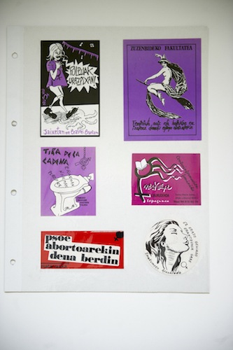 Euskal Herriko talde feministen pegatinek osatzen dute erakusketaren atal bat. Aizan eta Egizan mugimenduek 1988tik 2001era zabaldutako lanak daude hor; Euskal Herriko Bilgune Feministak bere toki propioa ere badu, eta Bizkaiko Emakumeen Asanbleak, edota LKIri lotutako Emakume Askapen Mugimenduak. Arestian aipatutako taldeak sinatu duen pegatina bat seinalatzen du Sanchezek. «No hay liberación de la mujer sin revolución, ni revolución sin liberación de la mujer» dio.