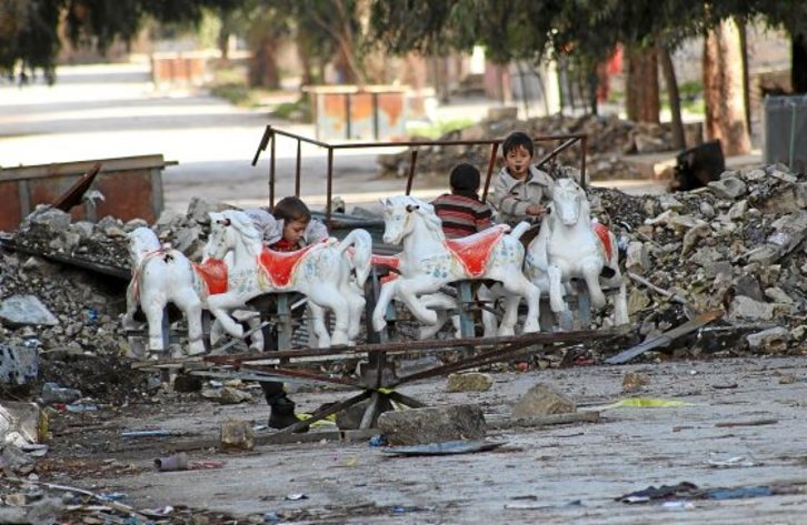 «Charlie Hebdo» aldizkariaren aurkako eraso odoltsu bezain zentzugabeak Parisen eta Mendebalde osoan izua sortu duen honetan –zentzugabea guretzat, ez, tamalez, egileentzat–, horra hor Siriako Alepo hirian zein gustura ari diren hiru haur hauek bonbek suntsitzea lortu ez duten barraka xumean jolasean. Irudiak miraria dirudi Siriako bigarren hiriburuak azken hiru urteotan jasandako gerrak eragindako hondamendi izugarria kontuan hartuta. Eta hortxe dago arazoa: bizitzea bera mirari bihurtzen denean, erlijioak hartzen du indarra. Eta erlijio orok du bere itzala, infernua alegia. Jainkoaren izenean infernu bihurtu du jihadista talde frantses batek «Charlie Hebdo» aldizkari satirikoa. Aldiz, infernuko suaren erdi-erdian, Alepon alegia, barraka kaskarraren gainean jirabiraka ibiltzen saiatzen dira umeak, hondakin artean, Europan, ezta Alepon bertan ere, ezertxo pasako ez balitz bezala. Bizinahia, infernu eta erlijio guztien gainetik.