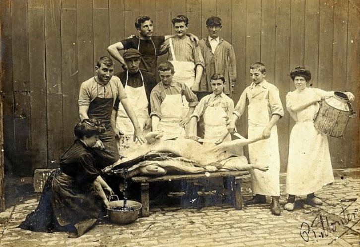 Jose Makazaga harakin eta Donostiako Orfeoiko kideak, senide eta bizilagunekin batera, 1905. urtean eta Donostiako kaia inguruan eginiko txerri hilketa jasotzen du irudiak. Euskal Herriko baserrietan oraindik ere bizirik dirauen ohitura da txerri hilketarena, eta, hala, urte osorako haragi eta hestekiak eskuratzen dira. Neguko hilabeteetan egin ohi da hilketa, ilargia ilbeheran dagoela; izan ere, herri jakintzak dioenez, ilgoran animaliaren haragiak indar gutxiago du eta ez da egoki mantentzen. Irudian bezala, senideek eta lagunek laguntzen dute erritu honetan eta ahaleginaren ordainetan txerrimuinak banatzen dira. Atsotitz ugarik jasotzen dute txerri hilketaren ohitura; hor dira “Ezkondutako urtea eta txerria hildako astea, onenak”  edo “Bostak eta iluna, txerria hiltzeko eguna” esaera zaharrak, besteak beste. XABIER GOENAGA FUNTSA