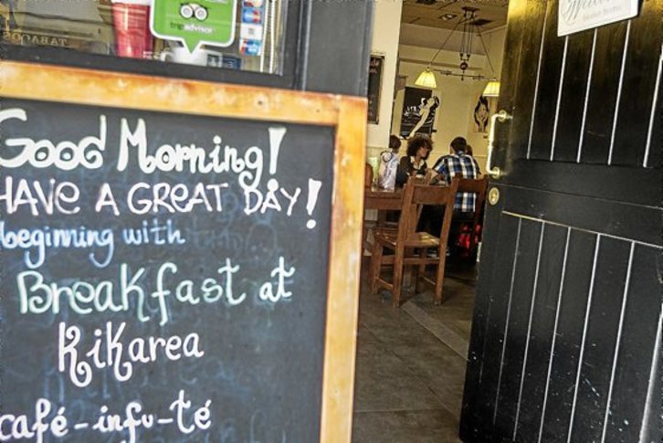 Kafea goxo hartzeko moduko goiz freskoa egiten du eta Kikarea Coffe and Bakery tabernak ezin egokiagoa dirudi zerbait beroa edateko, Bilboko Indautxu auzoan. Kafe usaina lagun, egunkariak lasai irakurtzeko moduko tokia da, zaratarik gabea, etxean egindako bizkotxo ederrak gordetzen dituzten kristalezko estalkien aurrean. Mahaietara begiratu eta ezin asmatu gabiltza bezeroen artean bilatzen ditugun EnglishCafé programako parte hartzaileak zeintzuk diren. Ez dago inor koadernoa eskuan. Solasean ari diren bizpahiru taldetxoen artean ere ez dirudi bat bera ere espresuki ingelesa praktikatzeko geratu denik. Beraz, tabernariarengana jo dugu. Hark esan digu ez dakiela seguru egun horretan geratuta dauden, ordutegi ezberdinak baitaude goizez eta arratsaldez, eskolon hartzaileen neurrira.