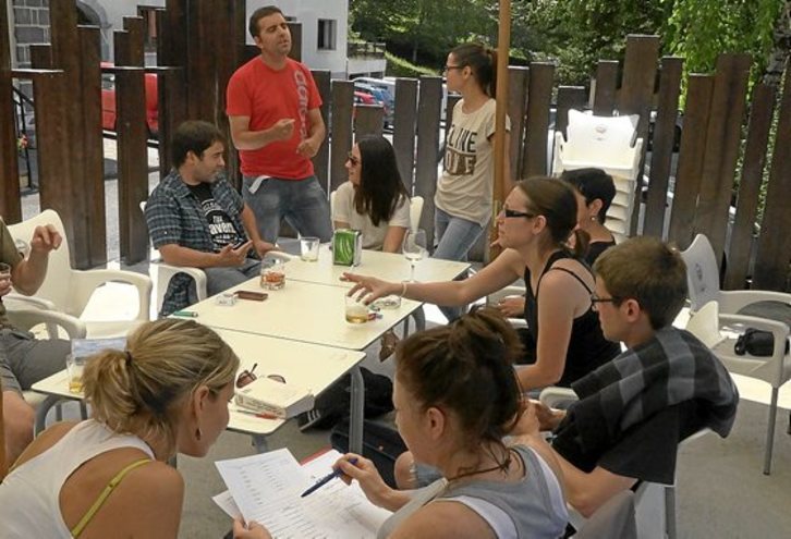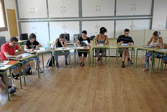 Asteburuko etenaldiaren ondoren, astelehen goiz argitsuan eskolara abiatu dira barnetegiko 24 ikasleak. Jan eta lo aterpean egiten dute, baina klaseak hartzeko herriko eskolara jotzen dute, udan hutsik baitago, kaskoaren beste aldean. Adinari dagokionez ere, aniztasuna da nagusi, hasi 20 urtetik eta 60 urteraino. Hiru irakasle dituzte –Amagoia Gordobil gasteiztarra, Ekaitz Larrazabal Katxo algortarra eta Aintzane Pradera barakaldarra– eta egunean hiru aldiz sartzen dira ikasgelara, bi goizean eta beste bat arratsaldean, bazkalondoren.