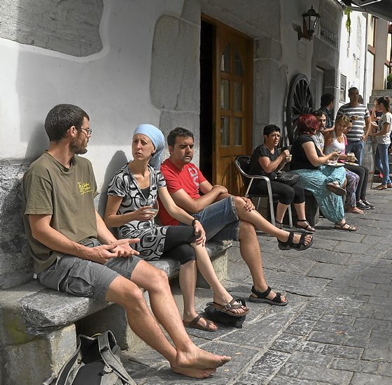 Bazkaria mintzapraktikarako une ezin hobea da. Kazetaria gonbidatu egiten dute aterpeko mahaira eta berehala egin dute taldeko kide. Jakina, berehala hasi da galdera zaparrada: nola esaten duzu, gose naiz edo gosea daukat? «Ba nik gosea daukat, baina azterketan hobe gose naiz jartzen baduzu». Eta beroa daukat edo bero nago? «Uf, kontu ezberdinak direla esango nuke…». Gaizki esanda dago “noski baietz”? Euskaraz pentsatzen duzu edo gazteleraz? Ondarrutarrei ulertzen al diezu? Hika badakizu? Azken hori galdetu duena Arrasaten lan egiten duen Gasteizko neska bat da; dagoeneko «gura dok» bezalakoak suelto erabiltzen ditu. Gozatua izan da bazkalordua, baita ondorengo kafea ere.