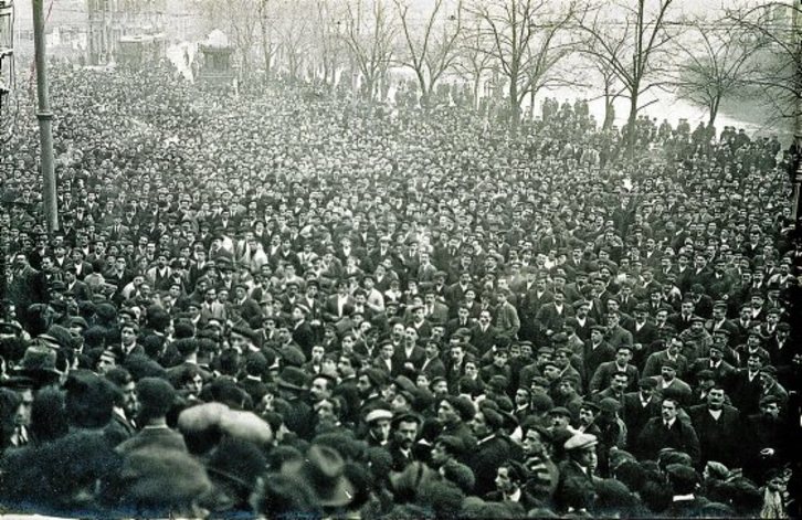 1911. urteko abenduaren 31n manifestazio jendetsua izan zen Bilbon ELA-SOV (Solidaridad de Obreros Vascos) sindikatuak deituta. Egun batzuk lehenago, abenduaren 15ean hain juxtu, Rufino Laiseca alderdi sozialistako zinegotziak –gerora Bilboko alkate izan zena– udalbatza batean egindako adierazpenek sekulako haserrea piztu zuten jendartean eta haserre horren ondorio izan zen manifestazioa. Laisecaren hitzetan, «euskal langileak beste herrialde batzuetakoak baino kaskarragoak dira gaitasunetan eta pentsaeran». Manifestazioa Posta kaletik abiatu eta udaletxeraino iritsi zen. Irudian manifestazioaren burua Bilboko udaletxera iristen den momentua jasotzen da. Bertan, alkateari idatzi bat eman zioten Laisecaren adierazpenak gaitzetsiz. Garaiko prentsak jaso zuenez, manifestazioan meatzeetako langile askok parte hartu zuen.