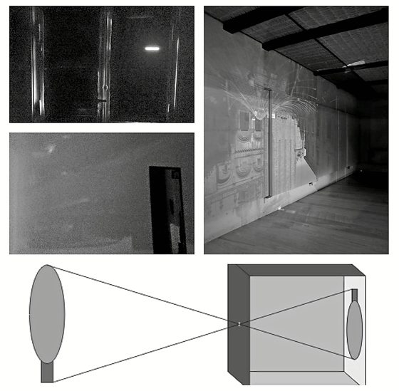 Aipatu esperimentua, irudiko ezkerreko bi irudietan jasotzen dena da. Lehendabiziko aldiz leihoa kartoiez estali nuenean –kartoiak berak zuen zirrikitua utziz eta kartoia leihoaren kontra oso ondo jarri gabe–, emaitza honakoa izan zen: San Mames eta itsasadarra, itzulbiratuta gelako pareta batean (irudimen apur batekin, mesedez). Esperimentua ondo gauzatuz gero, eskuineko irudikoaren moduko proiekzioa lortzen ahal da. Beheko irudian esperimentu honen ohiko eskema jasotzen da, kamera ilun gisa ezaguna, baina kasu zehatz honetan kamera estenopeiko deritzana. Artikulua prestatzeko orduan jakin dut hala deitzen zaiela lenterik erabiltzen ez duten kamara ilunei, soilik zulotxoa (estenopoa, grezieratik: esteno=estu eta ope=irekidura) eta espazio (kutxa, gela...) iluna. Hala, gela batean sartzen den argi guztia zulotxo batetik soilik sartzen bada, lortzen dena honakoa da: puntu bakoitzetik heltzen den argi izpiak gelako hormetako puntu bakarrean jotzea, eta, beraz, zulotxotik kanpora begiratuz ikusiko genukeena barruko hormetan proiektatua ikustea. Itzulbiratzea zergatik ematen den nahiko ulergarria da: zulotxotik zerua ikusi nahiko bagenu, begia zulotik beherago eraman beharko genuke eta kalea ikusteko berriz zulotik goraxeago. Beraz, zerua gelako lurrean izango dugu, eta, kalea, sabaian.