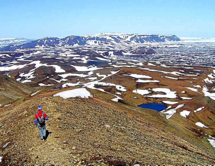 Piramide beltz bat da Hlidarfjell, 711 metrokoa, Myvatn lakuaren ondoan altxatzen dena. Ordu pare bat behar izan genituen Josuk eta biok, magma gogortutako maldan gora, gailurra zapaltzeko. Ikusmira zorabiagarria zabaldu zitzaigun, paisaia estralurtarra: laba zelai arrakalatu eta elurtuak, kono bolkanikoak, krater lehertuak, urmaelak irakiten, fumarolak… Baina Agustinek marraztutako harri piloaren arrastorik ez tontorrean.