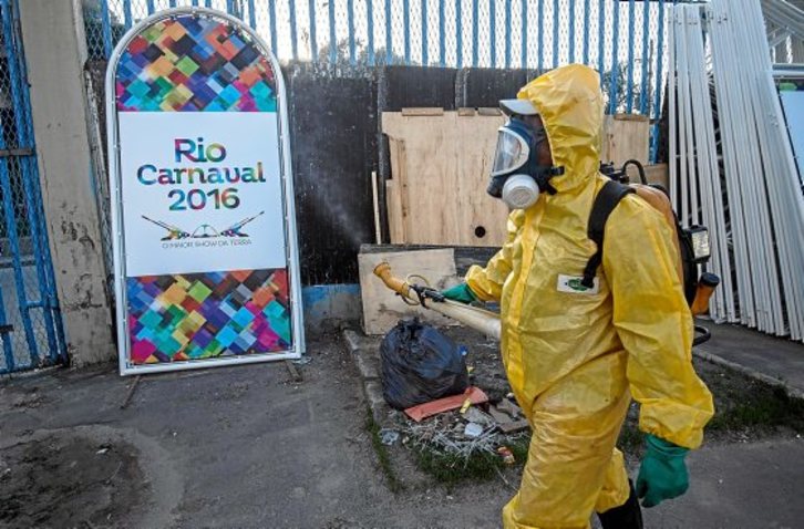 Zika birusak sekulako buruhausteak eragin ditu Amerikako makina bat herrialdetan. «Aedes aegypti» izeneko eltxoak kutsatzen ditu gizakiak eta normalean ez du arazo larririk eragiten, baina eltxoak zizta egiten diona haurdun badago kontua erabat aldatzen da, umea mikrozefaliarekin jaio baitaiteke: entzefaloa gutxiegi garatuta edukiko du, eta, kasu batzuetan, entzefalo-masarekin ere gauza bera gertatuko da. Brasilen iaz jaiotako umeetako 3.174k gaixotasun hori izan zuten, eta zika iritsi aurretik 160 kasu baino ez zituzten izaten urtean, Osasun Ministerioak emandako datuen arabera. Beraz, aurre egin beharreko arazo bihurtu da. Horregatik herrialde ezberdinetan makina bat toki fumigatzen ari dira, baita kanposantuak ere. Baina osasun langileak inon ez dira jantzi Rioko irudi horretan bezala, Sierra Leonan ebolaren aurka aritu direnen itxura hartu baitute. Sambodromoa bera ere fumigatu dute, gaur zortzi espero den jendetza hartu aurretik.