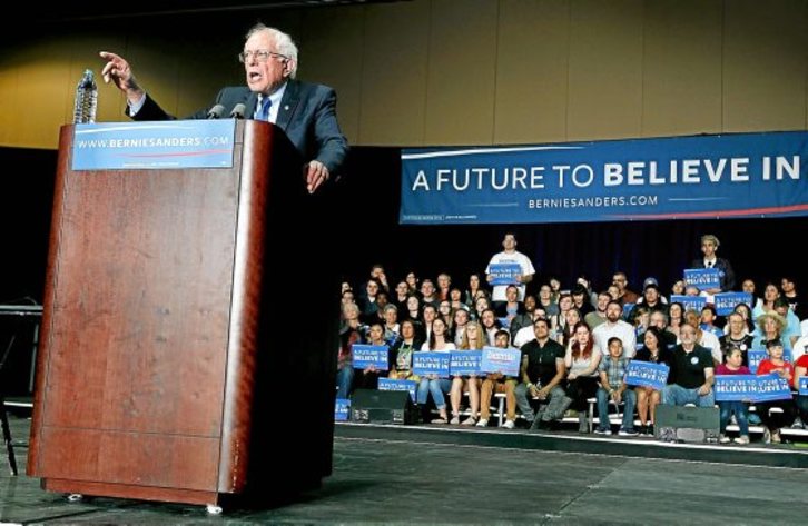 Bernie Sanders du izena, 74 urte ditu eta bizi osoa eman du borrokan egungo AEBetan izugarrizko iraultza suposatuko lukeen sozialismo demokratikoaren alde, gaztaroan Liberty Union Party alderdi antiinperialistan, gero Burlingtongo alkatetzan eta azkenik Vermont estatuko senatari demokrata bezala. Hillary Clinton alderdiaren hautagai kutunaren aurka primarioetan aurkeztea erabaki zuenean inork ez zuen sosik ematen «aitonaren» alde. Hasiera-hasieran eman zuen, ordea, lehen ustekabea, New Hampshiren; «astearte erraldoian» Michiganen lortutako garaipenak langile zurien artean duen oihartzuna berretsi zuen. Aste honetan, ordea, gutxiengo beltzak eta latinoak zeresan handia duten hegoaldeko estatuetan galtzeaz gain, espero ez zuen kolpe latza jaso du Ohion. Lasterketa, baina, luzea da, Sandersek ez baitu amore emateko asmorik. Diskurtso sozialista kanpaina demokrataren ardatz bihurtuz historia egin du. Historia egiten ari da.