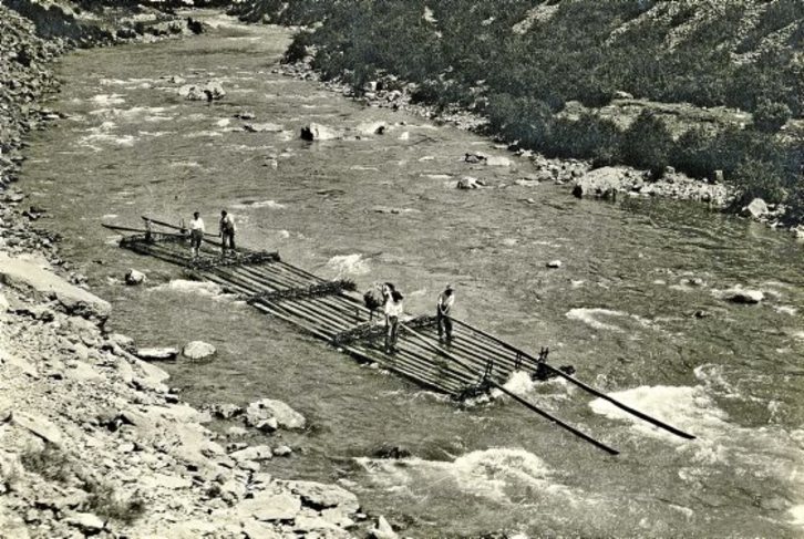 Egurra zen Erronkari, Zaraitzu eta Aezkoako ibarren diru-iturri nagusia, batez ere, baso-mozketaren ondorioz lortzen zutena. Lortutako egur hori ibaietan zehar garraiatzen zuten, almadiak erabiliz horretarako. Zerrategietan amaitzen zuen egurrak, ondoren tratatua izan zedin. Almadiak zuntz begetalez elkar lotutako egurrez eraikitako baltsak dira, arraun banarekin aurrealde eta atzealdean. Enborrak almadia bidez garraiatzeko garaia abenduan hasi eta maiatza edo ekainean amaitu ohi zen. Dagoen dokumentazioaren arabera, jakin daiteke XIV. mendetik datorren garraio-modu bat dela. Diego Quiroga y Losadarena da Ezka ibaian ateratako argazki hau. Turismoarekin zerikusia zuten lanen ondorioz egin zen ezagun eta Gerra Zibilaren garaian bere argazki-artxiboaren zati handi bat galdu zuen. Egun, Nafarroan dira bere lan gehienak.
