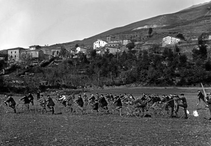 Argazkian txirrindulari kuadrilla ageri da, Berriozartik pasatzen, Ezkaba mendiaren magalean, XX. mendearen hasieran. 1910. urtean Berriozarrek 160 biztanle zituen eta nekazaritza eta artzaintza zituen ardatz. Argazkia Agustin Zaragüetak egina da, 1885. urteaz geroztik Iruñean bizi zen donostiarra. Zaragüetaren lanak izaera dokumentala dauka, bere argazkietan jaso baitzituen Iruñeko gertaerak, espektakuluak, irteerak eta mitinak, besteren artean. Baina hiriaren garapena eta aldaketak ere jaso zituen, egun desagertutako eraikin askoren lekuko bihurtuz. Bere lanak Nafarroako Museoan daude jasoak eta garrantzia berezia dute garaiko sanferminen ingurukoek. Horrez gain, erretratuak egiten ere lan bikaina egin zuen. Horren adibide dira Ignacio Baleztenak eginiko bertso hauek: «Joshe Miel de Zabaleta a Pamplona vino soldau/ y en la casa de Zaragüeta con un puro se ha retratau».